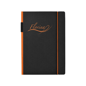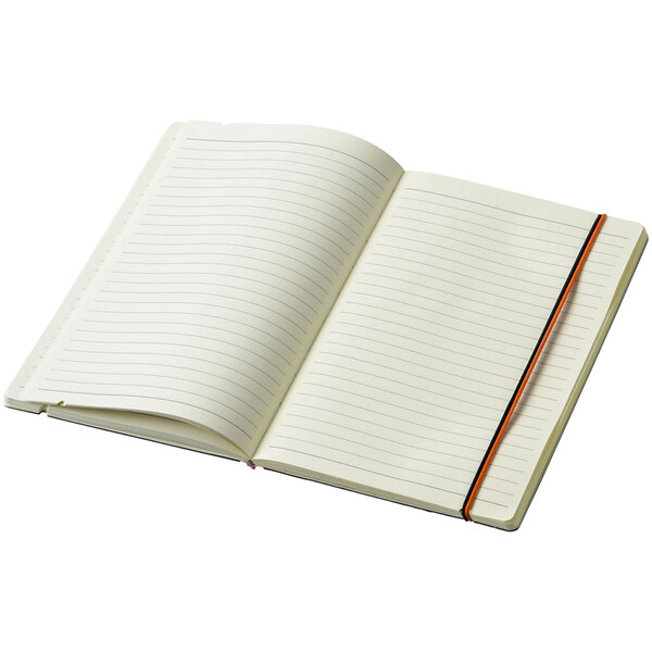 Блокнот Cuppia. Цветной корешок и эластичная застежка подчеркивают стиль этого классического эксклюзивного блокнота с черной твердой обложкой (размера A5) и его индивидуальность. Эластичная петелька для ручки на корешке предназначена для дополнительного удобства. Блокнот содержит 80 листов линованной бумаги (80 г/м²). Предлагается в подарочной коробке-рукав Journalbooks. Картон.Вы можете купить по низким ценам блокнот А5 "Cuppia", черный/оранжевый с вашим логотипом прямо сейчас, оформив доставку курьером