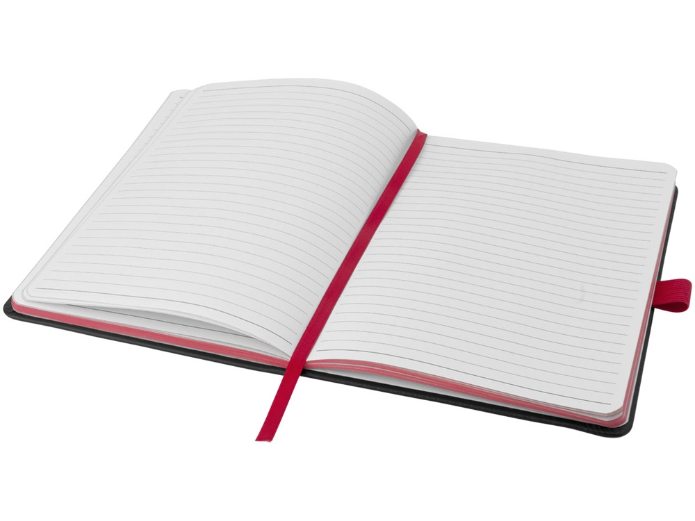 Блокнот Color edge A5. Блокнот А5, 80 листов бежевой бумаги (70 г/м2). С закладкой и эластичной застежкой. ПУ.Вы можете купить из наличия блокнот Color edge A5, черный/красный с вашим логотипом прямо сейчас, заказав быструю доставку