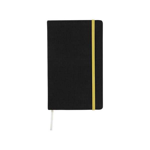 Блокнот Frappé тканевый. Блокнот в твердой обложке (размер А5 для ориентации) с модным художественным дизайном обложки для тех, кто осмеливается выделиться из толпы. Эластичная застежка, закладка, цветные края страниц и 80 листов кремовой линованной бумаги (80 г/м2). Ткань.Вы можете купить по низким ценам блокнот Frappé тканевый, черный/жёлтый с нанесением прямо сейчас, заказав доставку курьером