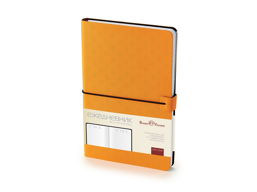 Недатированный ежедневник «Bravo» от бренда Bruno Visconti - это качественный и недорогой корпоративный подарок, произведенный специально под персонализацию. Представлен в универсальном формате А5. Элегантная мягкая обложка из гладкого кожзама имеет гибкую конструкцию и приятна на ощупь. В ежедневнике «Bravo» есть полезная справочная информация и телефонная книга, а также 272 страницы для записи идей, мыслей и составления рабочих планов. Есть закладка. Для изготовления страниц используется качественный бежевый офсет повышенной плотности (70 г/кв м). Ежедневник снабжен очень стильной горизонтальной резинкой, которую можно так же использовать, как держатель для ручки. Ежедневники от бренда Bruno Visconti можно персонализировать с помощью всех видов тиснения обложки. Наши ежедневники помогут быть успешным и эффективным в карьере и повседневной жизни!Вы можете купить из наличия ежедневник А5 недатированный «Bravo», оранжевый с нанесением прямо сейчас, купив быструю доставку