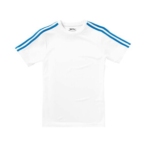 Женская футболка с короткими рукавами Baseline. Стандартный покрой. Стропы контрастного цвета на рукавах. Принт Slazenger на шве слева. Cool Fit. Сетчатый материал, 100% полиэстер с дышащей поверхностью. 145 г/м².Вы можете купить из наличия футболку "Baseline" женская, белый/небесно-синюю с вашим логотипом прямо сейчас, заказав доставку курьером