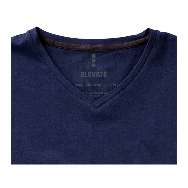 Футболка с короткими рукавами Kawartha. Стандартный покрой. V-образная горловина. Воротник из ткани изделия. Принт сзади. Атласная лента от плеча к плечу. Детали со швами Pick-Stitch. Хлопковая хорошо растягивающаяся ткань. Приятный на ощупь материал. Однослойная джерси, 95% органический хлопок кольцевого способа прядения и 5% эластан. 200 г/м².Вы можете купить по низким ценам футболку "Kawartha" мужскую с V-образным вырезом, тёмно-синюю с вашим логотипом прямо сейчас, купив доставку курьером