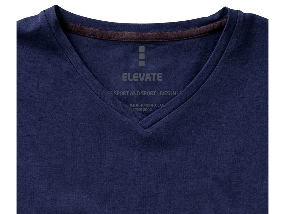 Футболка с короткими рукавами Kawartha. Стандартный покрой. V-образная горловина. Воротник из ткани изделия. Принт сзади. Атласная лента от плеча к плечу. Детали со швами Pick-Stitch. Хлопковая хорошо растягивающаяся ткань. Приятный на ощупь материал. Однослойная джерси, 95% органический хлопок кольцевого способа прядения и 5% эластан. 200 г/м².Вы можете купить из наличия футболку "Kawartha" мужскую с V-образным вырезом, тёмно-синюю с вашим логотипом прямо сейчас, оформив доставку курьером
