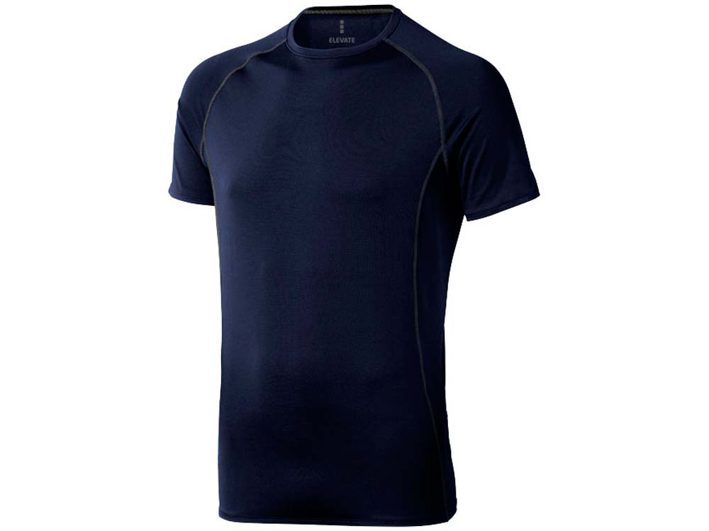 Футболка с короткими рукавами Kingston. Стандартный покрой. Атласная лента внутри горловины. Воротник из ткани изделия. Cool Fit. Отражающий лого сзади. Узкие контрастные полоски на рукавах реглан. Небольшой двойной шов на рукаве и внизу на кромке. Фигурные швы. Однослойная джерси, 88% полиэстер и 12% эластан. 200 г/м².Вы можете купить из наличия футболку "Kingston" мужская, тёмно-синюю с нанесением прямо сейчас, заказав доставку курьером