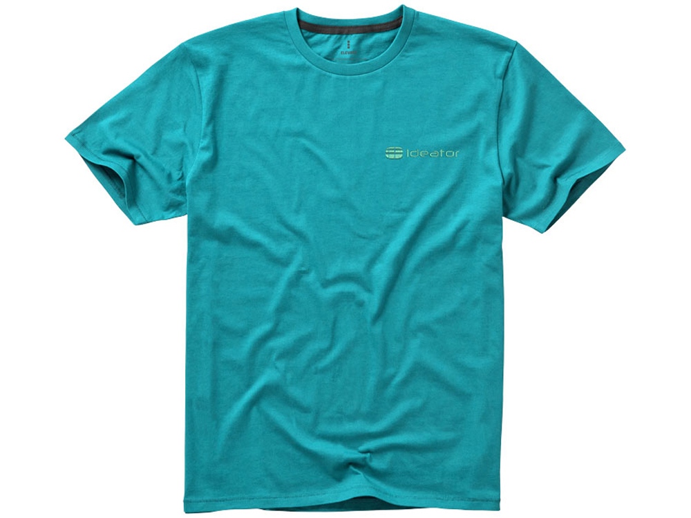 Футболка с короткими рукавами Nanaimo. Стандартный покрой. Атласная лента от плеча к плечу. Резинка 1х1 на воротнике. Приятный на ощупь материал. Принт сзади. Удобная для нанесения поверхность материала. Предварительная усадка. Детали со швами Pick-Stitch. Однослойная джерси гладкого переплетения, 100% чесаный хлопок кольцевого способа прядения. 160 г/м².Вы можете купить по низким ценам футболку "Nanaimo" мужская, аква с нанесением прямо сейчас, купив доставку курьером
