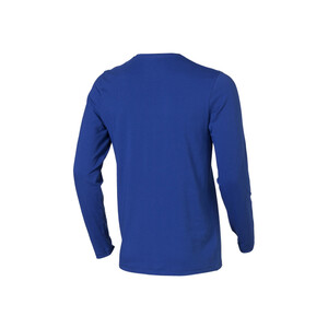 Футболка с длинными рукавами Ponoka. Стандартный покрой. Боковые швы. Атласная лента от плеча к плечу. Воротник из ткани изделия. Принт сзади. Детали со швами Pick-Stitch. Хлопковая хорошо растягивающаяся ткань. Однослойная джерси, 95% органический хлопок кольцевого способа прядения и 5% эластан. 200 г/м².Вы можете купить по низким ценам футболку "Ponoka" мужскую с длинным рукавом, синюю с вашим логотипом прямо сейчас, купив быструю доставку
