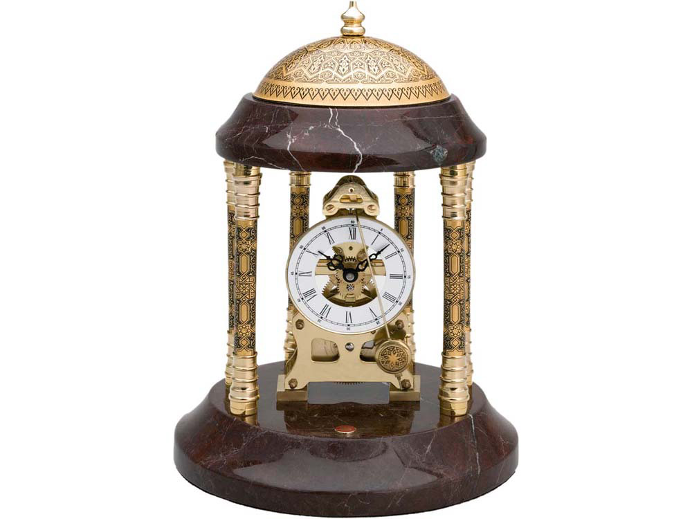 Замечательные настольные часы станут изюминкой в интерьере. Часы выполнены в виде беседки в восточном стиле, колонны которой украшены замысловатым орнаментом. Изумительное сочетание мрамора и золотистой латуни притягивает взгляд.