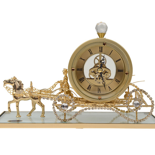 Золото и хрусталь – классическое сочетание, символизирующее роскошь, красоту и богатство. Интерьерные часы «Карета» будут прекрасным подарком в год лошади, но и в другое время порадуют глаз. Это хороший аксессуар для транспортной компании, которая хочет подчеркнуть богатство традиций или для офиса, оформленного под старину.