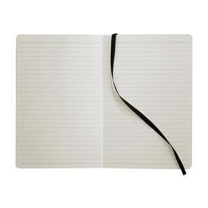 Классический блокнот с мягкой обложкой. Блокнот с мягкой на ощупь обложкой (ориентир размер А5) с эластичной застежкой, закладкой, кармашком для заметок внутри и 80 листов линованной бумаги (80 г/м²). Термо ПУ.Вы можете купить по низким ценам классический блокнот А5 с мягкой обложкой, чёрный с нанесением прямо сейчас, оформив доставку курьером