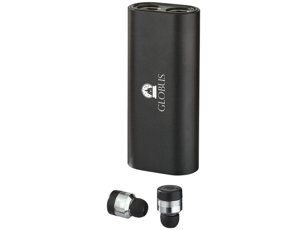 Металлические беспроводные наушники с чехлом повербанк. Отличная техническая комбинация два в одном. Легкие и компактные по-настоящему беспроводные наушники с алюминиевым чехлом повербанком, который может заряжать как наушники так и другие ваши девайсы. Наслаждайтесь музыкой до 3 часов при максимальной громкости. Для полной зарядки наушников потребуется около двух часов. Мощность литий-ионной батареи повербанка 2000 мAч с 5В/1А выходом. Наушники можно сложить в чехол. Упакованы в белую подарочную коробку Avenue. Алюминий.Вы можете купить из наличия металлические беспроводные наушники с чехлом пауэрбанк с нанесением прямо сейчас, купив доставку курьером