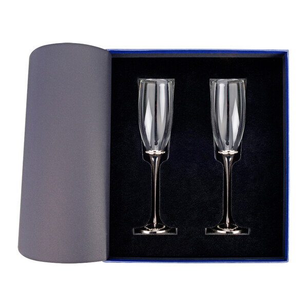 Роскошный набор включает в себя два бокала для шампанского и небольшой поднос. Бокалы из тонкого стекла на металлической ножке серебристого цвета задекорированы сияющими стразами. Бокалы подчеркнут торжественность момента.Вы можете купить из наличия набор «алмазный фонд». Castello Giorgio с вашим логотипом прямо сейчас, заказав доставку курьером