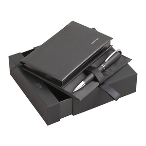 Стильный подарочный набор в фирменном футляре включает в себя небольшой блокнот формата А6 и шариковую ручку. Набор выполнен в строгом, классическом стиле и превосходно подойдет для подарка аскетичным деловым людям.