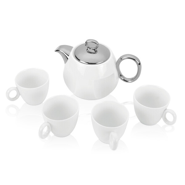 Стильный чайный набор станет оригинальным подарком для дома. В чайный набор входит чайник на 960 мл, четыре керамические чашки и деревянная подставка-поднос. Крышка, носик и ручка чайника покрыты серебристым лаком. Рекламную информацию можно нанести на деревянную подставку, чашки или чайник с помощью тампопечати, деколи или гравировки.