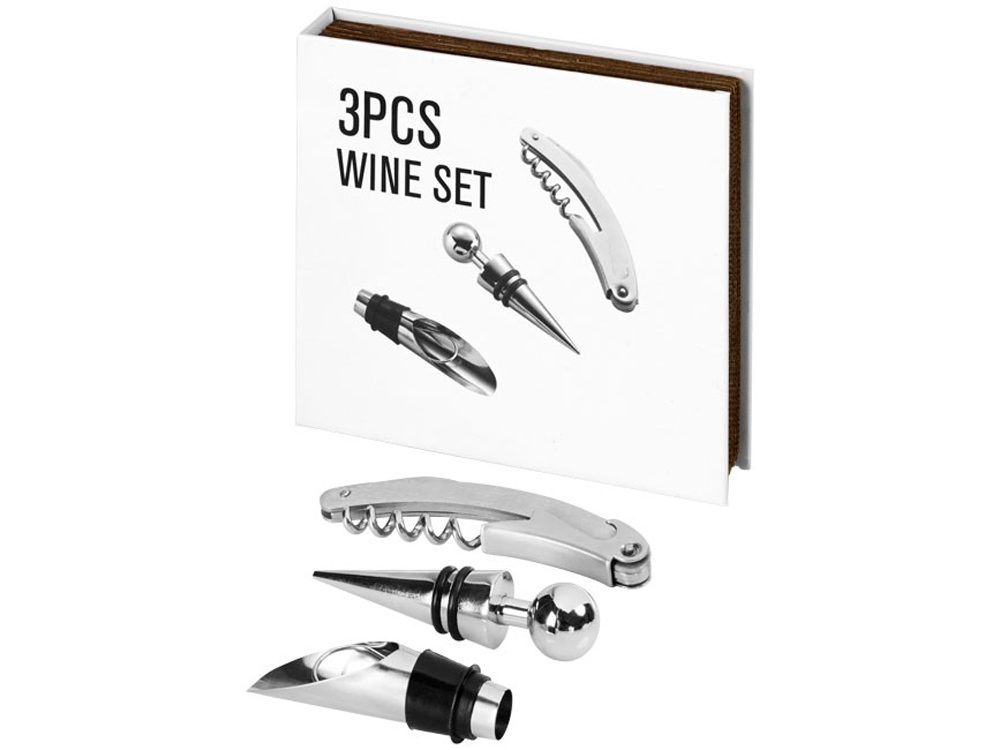 Набор для вина Nantes из 3 предметов. В набор входит пробка для вина, насадка на бутылку и штопор. Нержавеющая сталь.Вы можете купить из наличия набор для вина Nantes из 3 предметов, серебристый с вашим логотипом прямо сейчас, купив доставку курьером