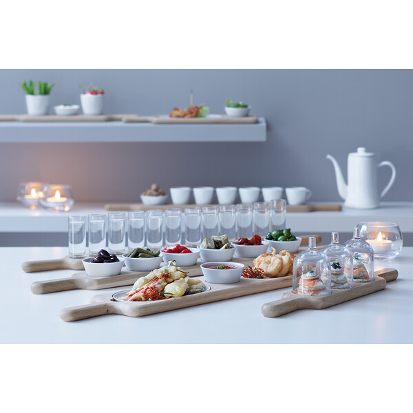 Набор фарфоровых чаш на деревянной подставке был создан для подачи орехов, оливок, соусов и других закусок. В набор входит 6 чаш объёмом 100 мл и подставка, которая сделана из натурального дуба. Набор упакован в красивую коробку и его можно захватить с собой на домашнюю вечеринку для хозяина(-ки) или подарить на особую дату друзьям. Комбинируйте наборы для подачи закусок со стопками из коллекции Paddle для создания завершенной композиции. Paddle — наборы этой коллекции были созданы дизайнерами LSA International под впечатлением от тирольских горных баров, где домашний шнапс и закуски принято предлагать в шотах и чашках на деревянных досках, передавая их от одного гостя другому. Это всегда добавляет непринужденности и веселья любому застолью и вечеринке. Изделия из фарфора можно использовать в микроволновой печи и мыть в посудомоечной машине при низких температурах с использованием щадящих моющих средств. Деревянные детали рекомендуется протирать мягкой щеткой и влажной тканью, позволяя дереву высохнуть самостоятельно. Не погружайте их в воду и не мойте в посудомоечной машине. Иногда в готовом изделии из выдувного стекла встречаются пузырьки воздуха — это нормально и вполне допускается технологией ручного производства. Такие пузырьки воздуха внутри не являются браком.Вы можете купить из наличия набор из 6 чаш на подставке paddle 77 см дуб с вашим логотипом прямо сейчас, оформив быструю доставку
