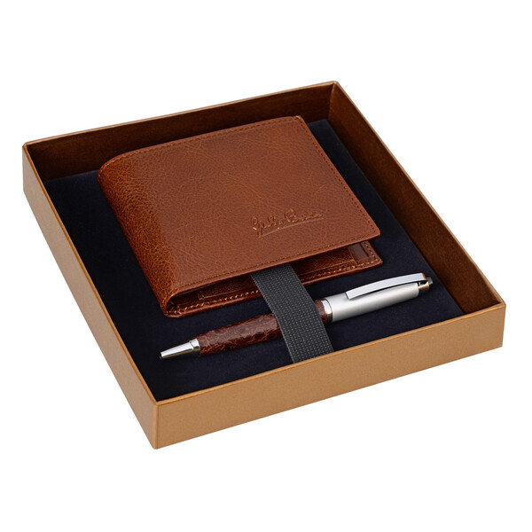 Отличный подарочный набор для мужчин включает в себя портмоне из натуральной кожи и шариковую ручку в металлическом корпусе, задекорированную кожей. Составляющие набора выполнены в сочетающейся цветовой гамме.