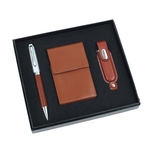 Набор состоит из визитницы, шариковой ручки и USB-флешки на 1 Гб, выполненных в приятной коричневой цветовой гамме. Оригинальный способ отметить отличившихся сотрудников и партнеров.
