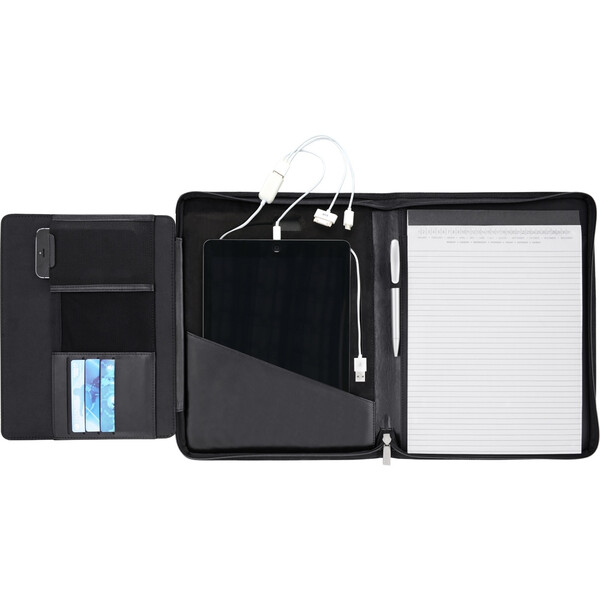 Отличный подарок для организованных людей! Папка для документов с блокнотом, держателем для планшета и встроенным зарядным устройством мощностью 4000 mAh поможет вам подготовиться к любой нештатной ситуации в офисе, на презентации или в командировке.