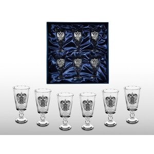 Подарочный набор «Двуглавый орел». В состав набора входит шесть граненых лафитников емкостью 50 мл. с оловянными барельефами «Двуглавый орел». Материал барельефа: сплав с содержанием олова не менее 95%(пьютер). Художественное литье,чернение с эффектом антикварного серебра, полировка. Ручная работа. Упаковка подарочная с атласным ложементом. В данном наборе рюмки изготовленны из хрусталя традиционной рецептуры с содержанием 24% PbO.