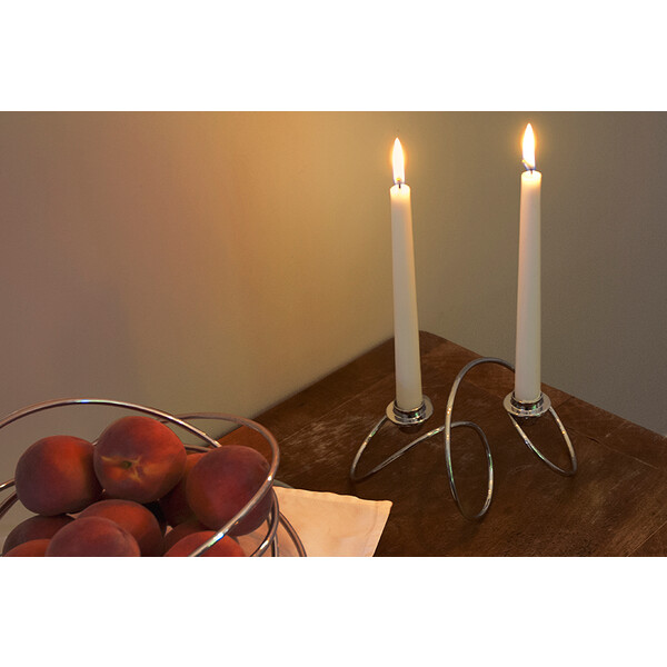 Подсвечник из хромированной стали в красивом витом дизайне. Подходит для двух стандартных высоких свечей диаметром 22-24 мм. Красивый подсвечник, сделанный из единого куска хромированной стали. С двух сторон расположены углубления для постановки стандартных высоких свечей. Подсвечник Dinner Loop освежит сервировку стола как в очень аристократичном дизайне, так и в легких минималистичных формах. Дополненный цветами и лентами или объединенный с несколькими другими похожими подсвечниками, он станет изысканным завершающим штрихом любой композиции. Loop Maison - коллекция украшений для столовой от бренда Black+Blum, вдохновленная кривой Фибоначчи - идеальными пропорциями природы, естественными и визуально притягательными.