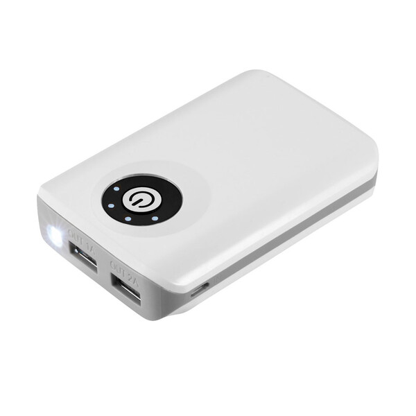 Зарядное устройство "PB-6600 Vault". Высокая емкость по умеренной цене. Зарядное устройство Vault емкостью 6600 мА/ч с двумя выходами: 5 В / 1 A и 5 В / 2 A. Светодиодный фонарик на конце устройства. Кнопка питания включает и выключает зарядное устройство и указывает количество оставшегося заряда. Устройство автоматически переключается в спящий режим для экономии заряда. Включает кабель для зарядки с коннекторами USB и micro USB.Вы можете купить из наличия портативное зарядное устройство "PB-6600 Vault", белое с вашим логотипом прямо сейчас, заказав быструю доставку