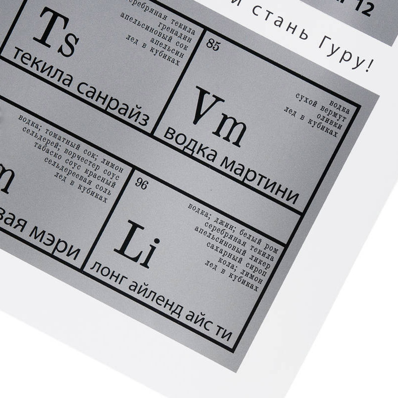 Как известно, Менделееву его таблица приснилась, но мало кто знает, что однажды в пятницу он увидел еще одну! Откройте для себя новый напиток, выпейте его и сотрите защитный слой у нужной клетки (монеткой, как на лотерейном билете). Вас ждет нелегкий, но познавательный путь к вершине алкогольного мастерства! Ощутите аромат зеленых виноградников Франции, темперамент Испании, и безудержное веселье пиратов Карибского моря. Только после того, как будут стерты 8 очередных клеток, вы можете перейти на новый уровень. Так что можно устроить из вечеринки настоящее соревнование. Упакован в тубус.Вы можете купить из наличия постер-игра"периодическую систему употребления" с нанесением прямо сейчас, заказав быструю доставку