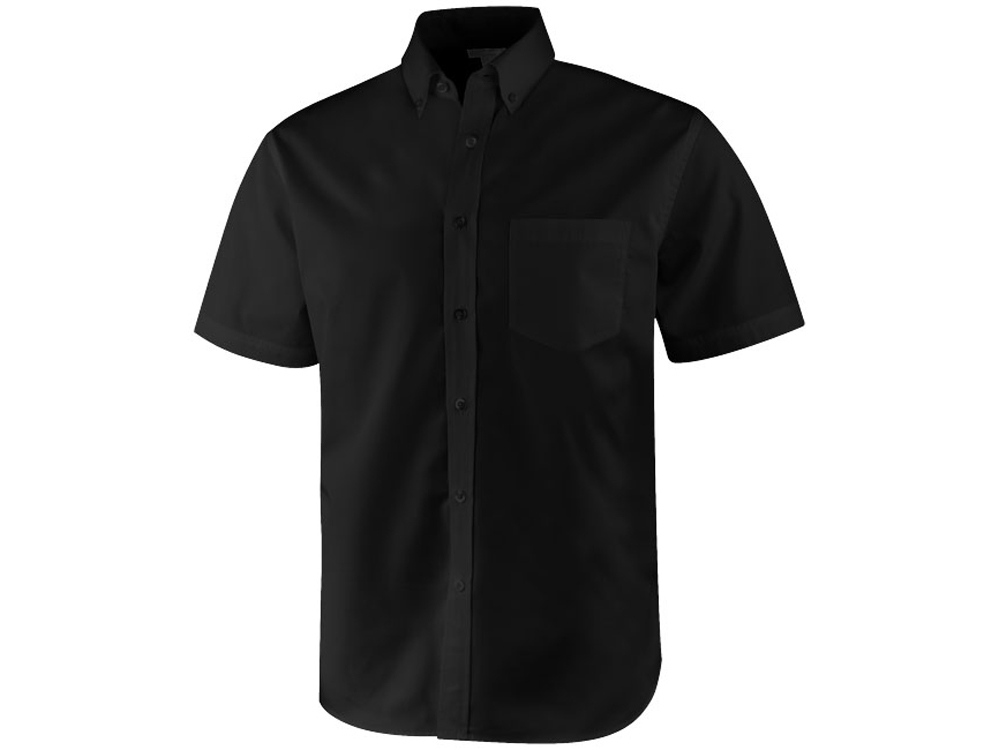 Рубашка с короткими рукавами Stirling. Универсальный покрой. Мужская модель с пуговицами на воротнике. Однотонные пуговицы. Плоские швы. Саржа с 65% полиэстера и 35% хлопка.Вы можете купить по низким ценам рубашку "Stirling" мужскую с коротким рукавом, чёрную с вашим логотипом прямо сейчас, заказав доставку курьером