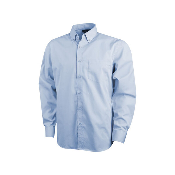 Рубашка с длинными рукавами Wilshire. Универсальный покрой. Регулируемый манжет на одной пуговице. Однотонные пуговицы. Плоские швы. Нагрудный карман (мужская модель). Саржа с 65% полиэстера и 35% хлопка.Вы можете купить из наличия рубашку "Wilshire" мужскую с длинным рукавом, синюю с вашим логотипом прямо сейчас, оформив доставку курьером