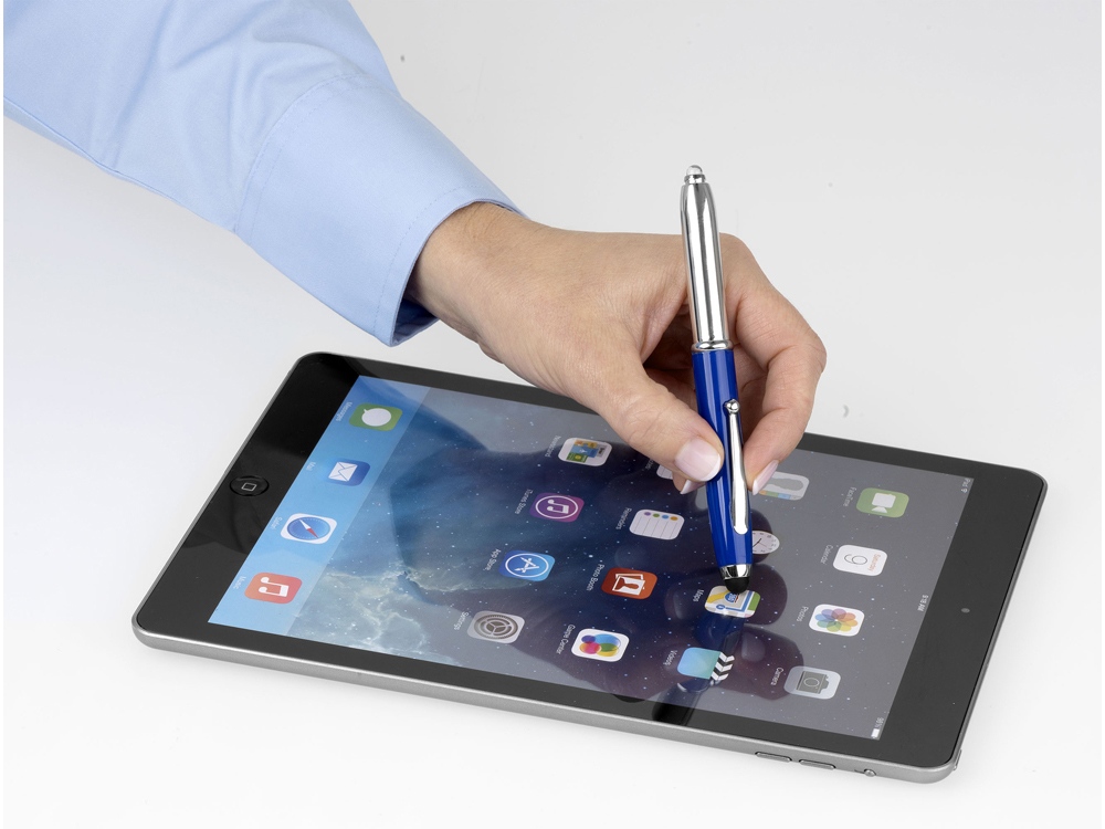 Шариковая ручка-стилус Xenon. Шариковая ручка-стилус с одним светодиодом и съемным колпачком. Батарейки включены в комплект. Металл.Вы можете купить из наличия ручку-стилус шариковую "Xenon", ярко-синий, синюю чернила с вашим логотипом прямо сейчас, заказав доставку курьером