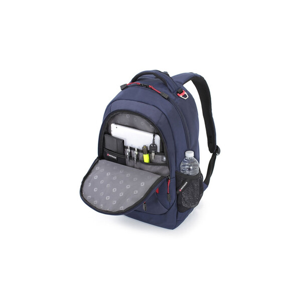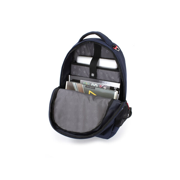 Рюкзак включает в себя: -отделение с мягкими стенками для ноутбука с диагональю экрана 15”, -карман-органайзер для мелких вещей с отделением для телефона, пишущих принадлежностей, ключей и пр., -карман для быстрого доступа, -два боковых кармана для бутылок или зонта выполненные из специальной двойной эластичной сетки, -спинка рюкзака имеет специальную рельефно-анатомическую поверхность и оснащена системой циркуляции воздуха AirFlow, -ручка и ручка с мягкими вставками предназначены для удобства переноски, -регулируемые эластичные плечевые ремни анатомической формы с пропускающей воздух подкладкой и с петлей для очков.Вы можете купить по низким ценам рюкзак 28л с отделением для ноутбука 15''. Wenger, тёмно-синий с нанесением прямо сейчас, оформив быструю доставку