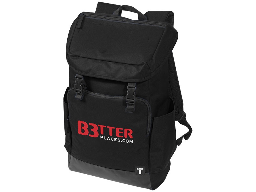 Рюкзак для ноутбука 15,6". Рюкзак для ноутбука 15,6" с дном и з тарпаулина, для легкой очистки. Большой передний карман на молнии для мелочей. Боковой карман для бутылки, застежки клапана можно использовать для фиксации зонтика или дождевика. 300D Полиэстер и тарпаулин.Вы можете купить по низким ценам рюкзак для ноутбука 15,6", чёрный с вашим логотипом прямо сейчас, заказав доставку курьером