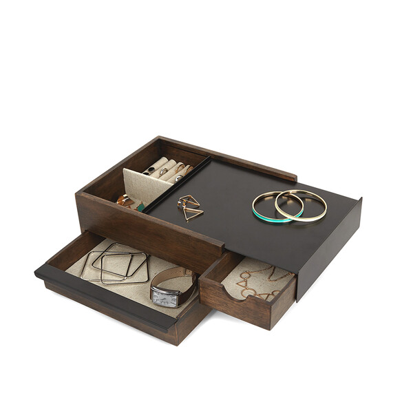 Большая деревянная шкатулка для украшений с несколькими отделениям. Верхнее отделение оснащено кармашками для колец или запонок и небольшими ящичками для прочих мелочей. Нижняя часть предназначена для хранения более крупных аксессуаров: часов или браслетов. Благородное сочетание тёмного дерева и металла с чёрным матовым делает шкатулку отличным подарком для мужчины. Дизайн: Sung wook ParkВы можете купить по низким ценам шкатулку для украшений stowit чёрный-орех с вашим логотипом прямо сейчас, оформив доставку курьером
