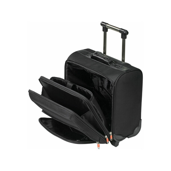 Отделение для ноутбука 17". Отделение для документов. Передний карман на молнии для аксессуаров. Отдельный чехол для флеш-карт.Вы можете купить из наличия сумку "Orange Line" на колесиках, чёрную с вашим логотипом прямо сейчас, оформив быструю доставку