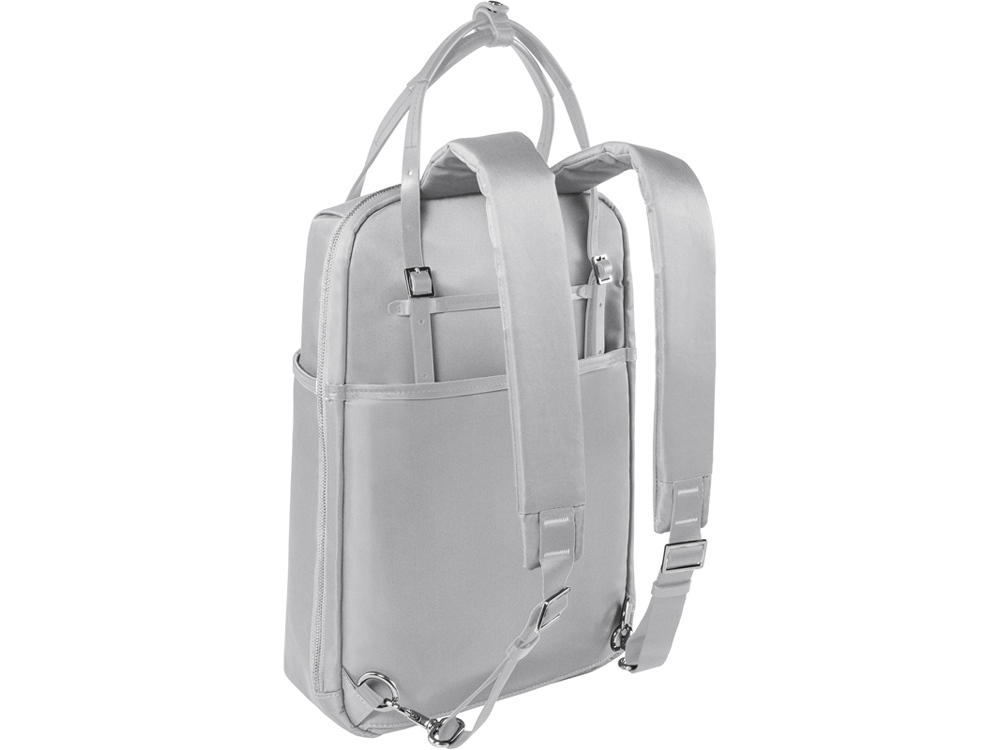 Трансформируемая сумка-рюкзак (два в одном) с отделением для ноутбука с диагональю экрана 15,6" с карманом для планшета/электронной книги. ХАРАКТЕРИСТИКИ И СВОЙСТВА: • Мягкое отделение для ноутбука с диагональю экрана до 15,6’’ (40 см) и карман для планшетного компьютера / устройства для чтения электронных книг, • Организационная панель с кармашком для смартфона, две большие петли для ручек, в которые также помещается губная помада, и микрозамшевый кармашек для ценных вещей на молнии, идеально подходящий для хранения ювелирных изделий или солнечных очков, • Задний карман преобразуется в рукав для продевания сквозь телескопическую ручку чемодана, • При необходимости мягкие регулируемые ремни, используемые для ношения сумки в качестве рюкзака, могут быть спрятаны за задним карманом, • Благодаря регулируемым кожаным ремням сумку можно носить через плечо, • Элегантная серебристая фурнитура и элементы из натуральной кожи.