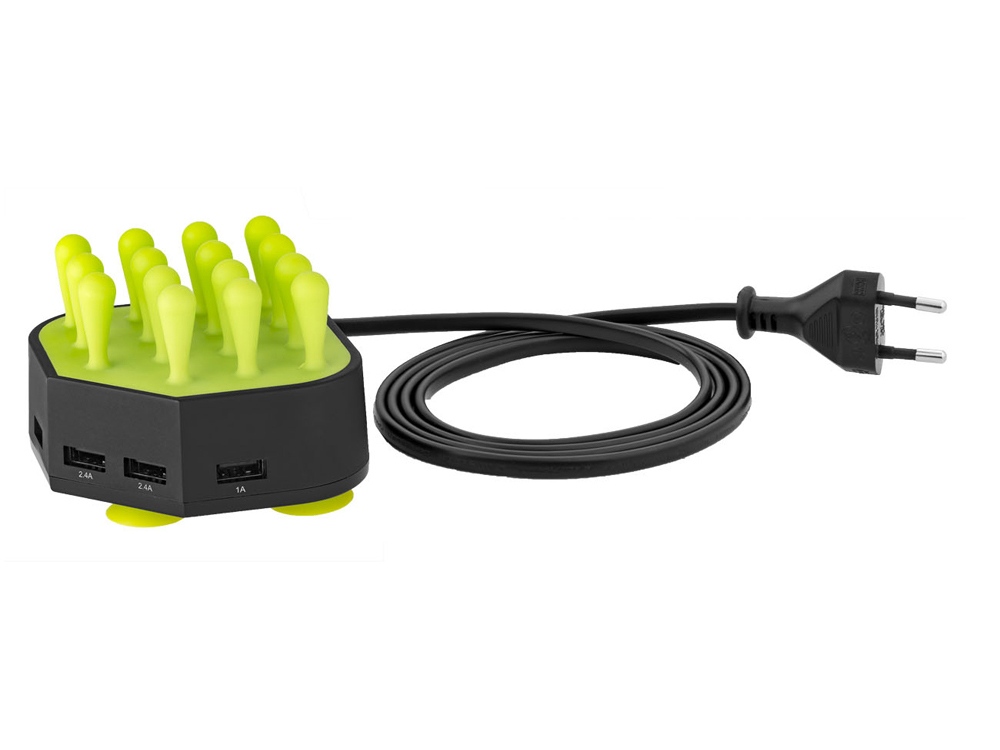 Зарядная станция Turf. Зарядная станция Turf идеальна для зарядки множества девайсов одновременно. Верхняя часть мягкая и может держать до трех девайсов одновременно. 4 порта usb (2x 5V/2.4A and 2x 5V/1A) и адаптер. Упакован в белую коробку Avenue. АБС пластик силикон.Вы можете купить из наличия зарядную станцию Turf, черный/лайм с нанесением прямо сейчас, заказав быструю доставку