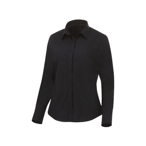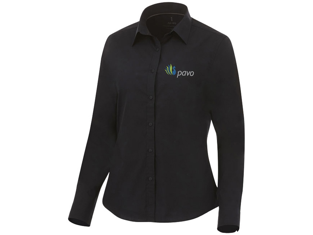 Женская рубашка с длинными рукавами Hamell. манжет на одной пуговице. Атласная окантовка внутренней части горловины. Швы моделирующие фигуру и приталенный крой. Гравированные пуговицы в цвет изделия. Комфортный ярлык-трансфер на изделии. Поплин из 96% хлопка и 4% эластана. 118 г/м².Вы можете купить из наличия женскую рубашку с длинными рукавами Hamell, чёрную с нанесением прямо сейчас, заказав доставку курьером