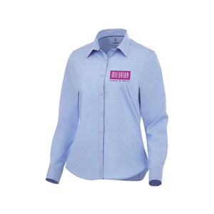 Женская рубашка с длинными рукавами Hamell. манжет на одной пуговице. Атласная окантовка внутренней части горловины. Швы моделирующие фигуру и приталенный крой. Гравированные пуговицы в цвет изделия. Комфортный ярлык-трансфер на изделии. Поплин из 96% хлопка и 4% эластана. 118 г/м².Вы можете купить из наличия женскую рубашку с длинными рукавами Hamell, светло-синюю с вашим логотипом прямо сейчас, оформив доставку курьером