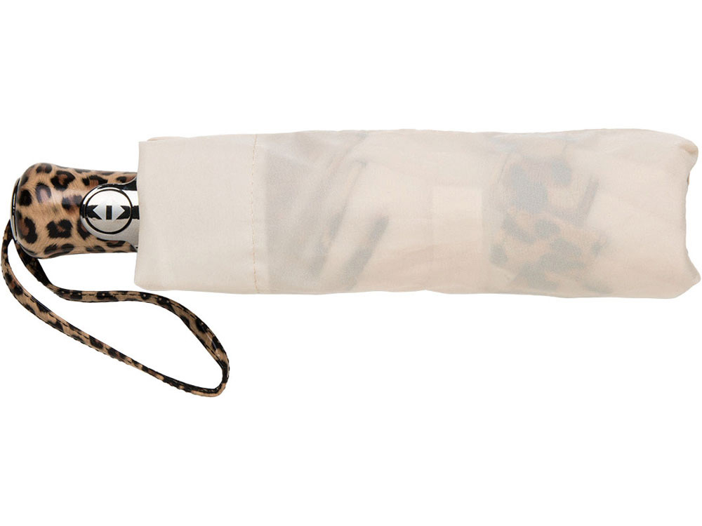Симпатичный складной зонт пригодится каждой моднице. Зонт, выполненный в светлых тонах, задекорирован небольшим бантиком хищной расцветки. Зонт компактно складывается на хранение и переноску.