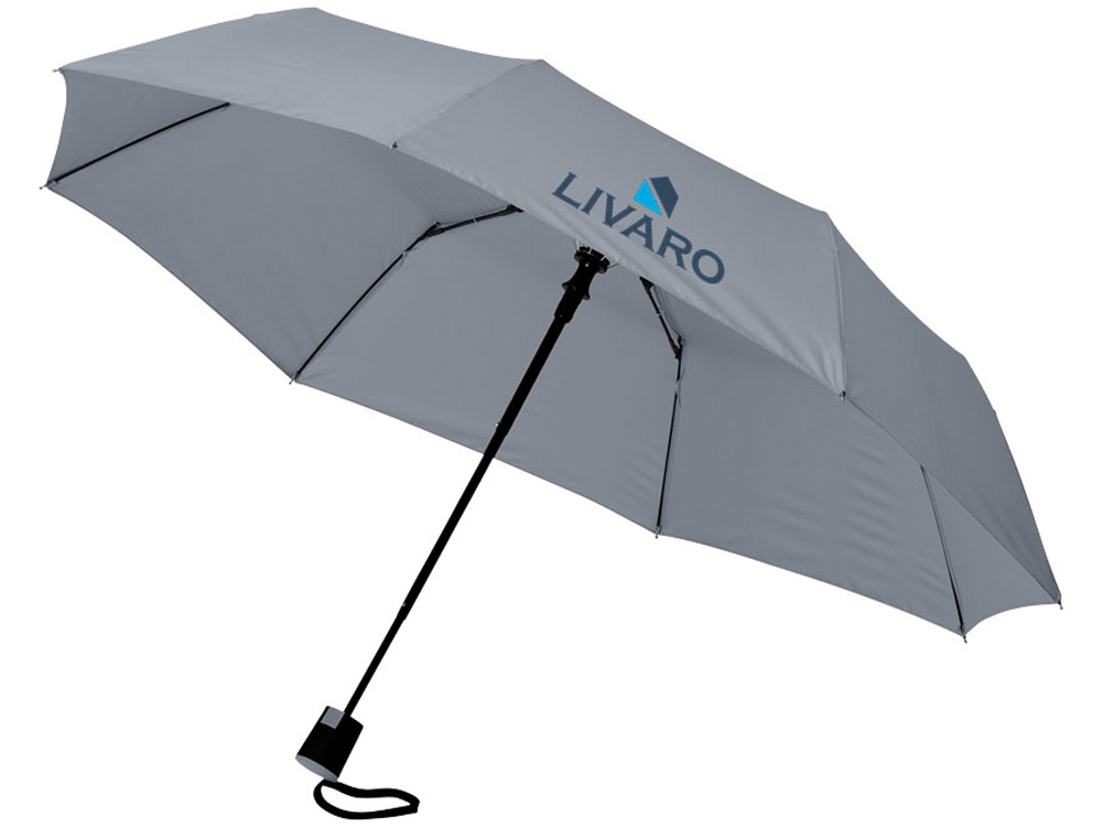 Зонт Wali трехсекционный 21" с автоматическим открытием. Зонт 21" с металлическим стержнем, спицами из стекловолокна и пластиковой ручкой с прорезиненным покрытием. В комплекте чехол. Полиэстер эпонж.Вы можете купить из наличия зонт Wali полуавтомат 21", серый с нанесением прямо сейчас, оформив быструю доставку