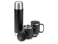 Термос на 500 мл и две термокружки на 300 мл из нержавеющей стали сверху декорированы пластиком, который не даст вашим рукам обжечься. Термос сохранит ваши напитки теплыми более 6 часов. На термос и кружки можно нанести логотип.